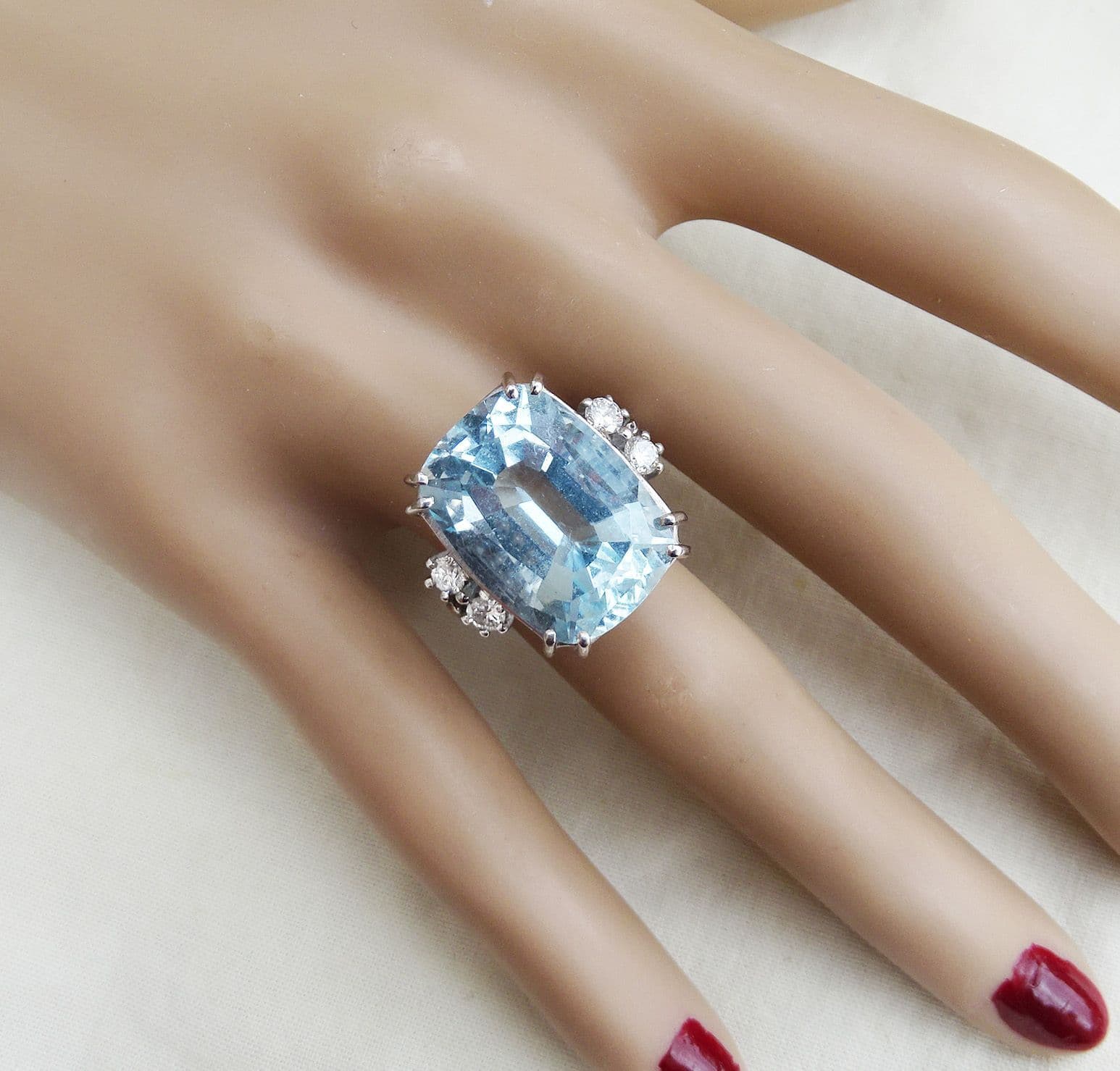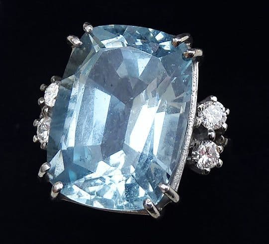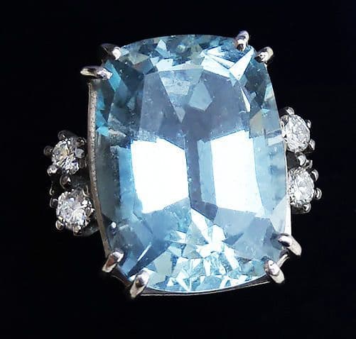 This fabulous art deco ring showcases a wonderful 17ct aquamarine. Measuring 18mmx13.5mmx9mm it has a mesmerising ice blue colouring. An absolute show stopper of a gemstone.