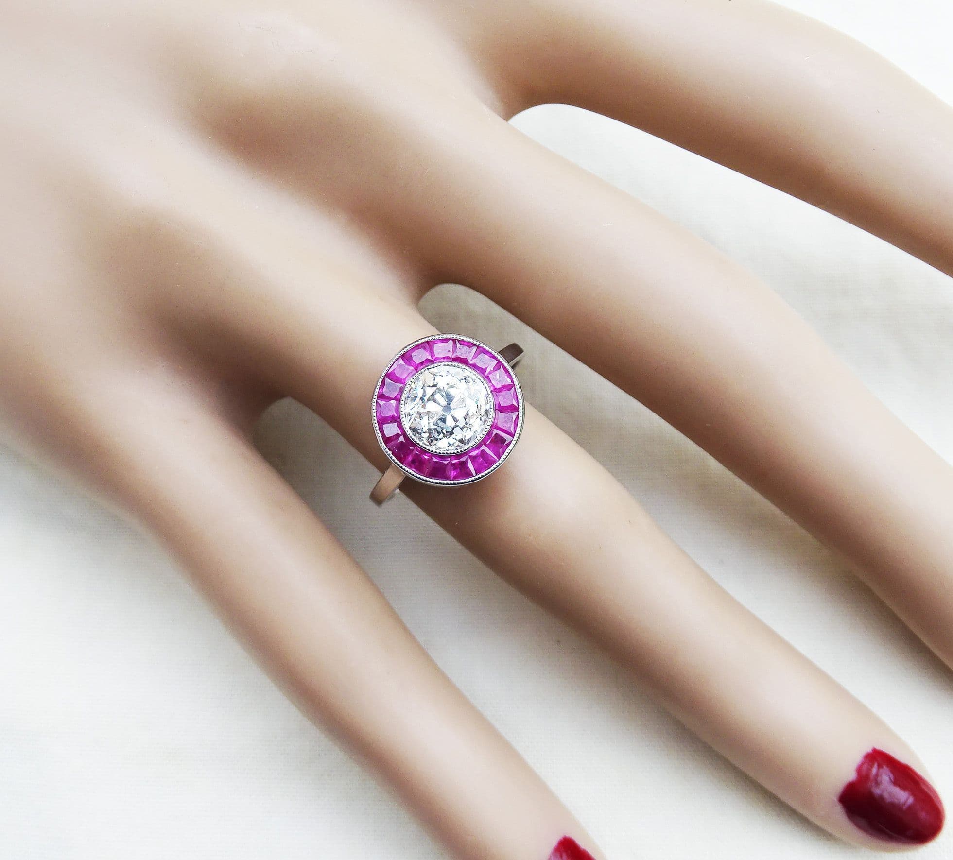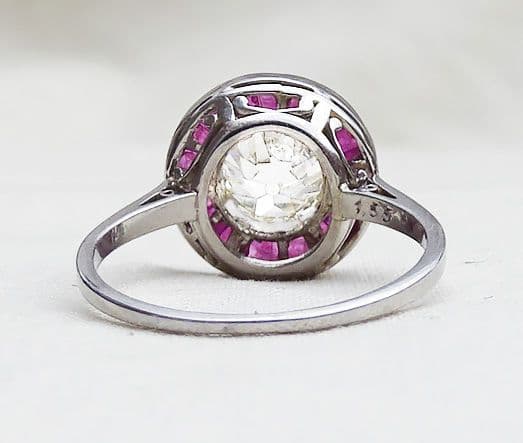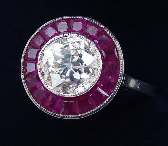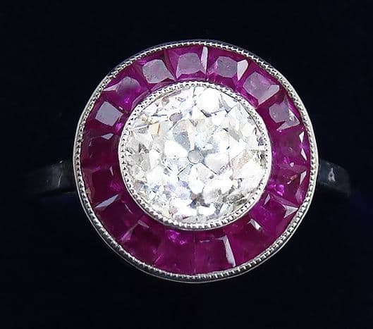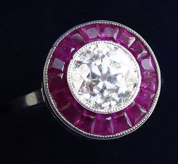 Stunning art deco platinum ruby and 1.55ct old cut diamond vintage antique target ring